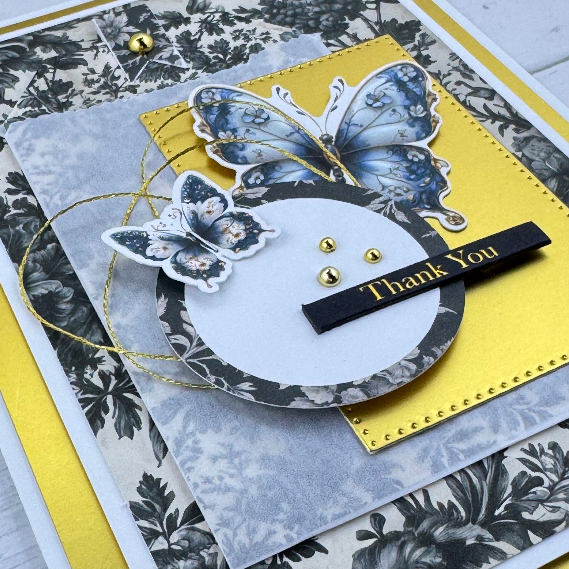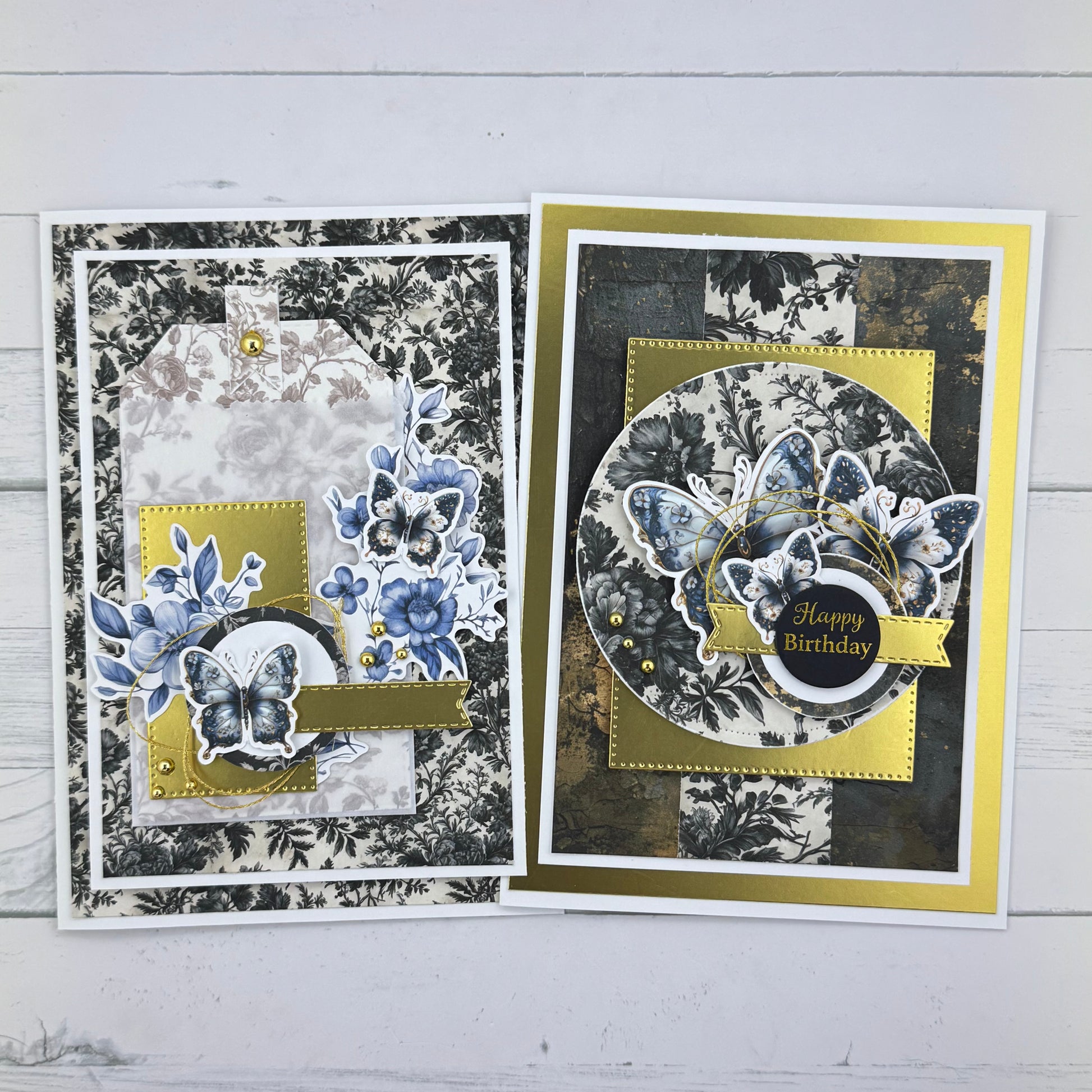 This wonderful kit makes 6 cards using the Fleur Azure collection from Simply Stated Design. You'll take the product and transform it, building layers and dimension to create these beautiful card faces. The papers are beautiful and the pops of gold bring the ephemera to life.
