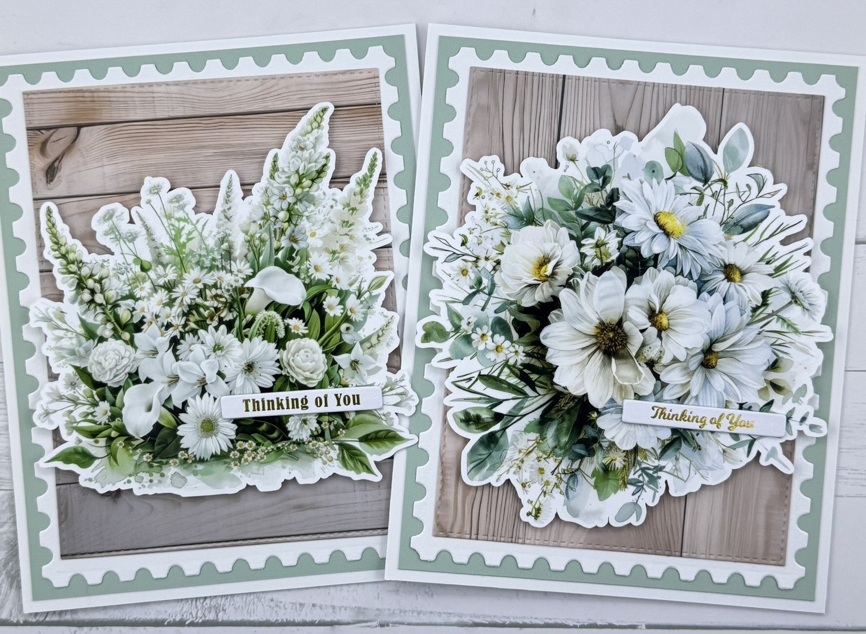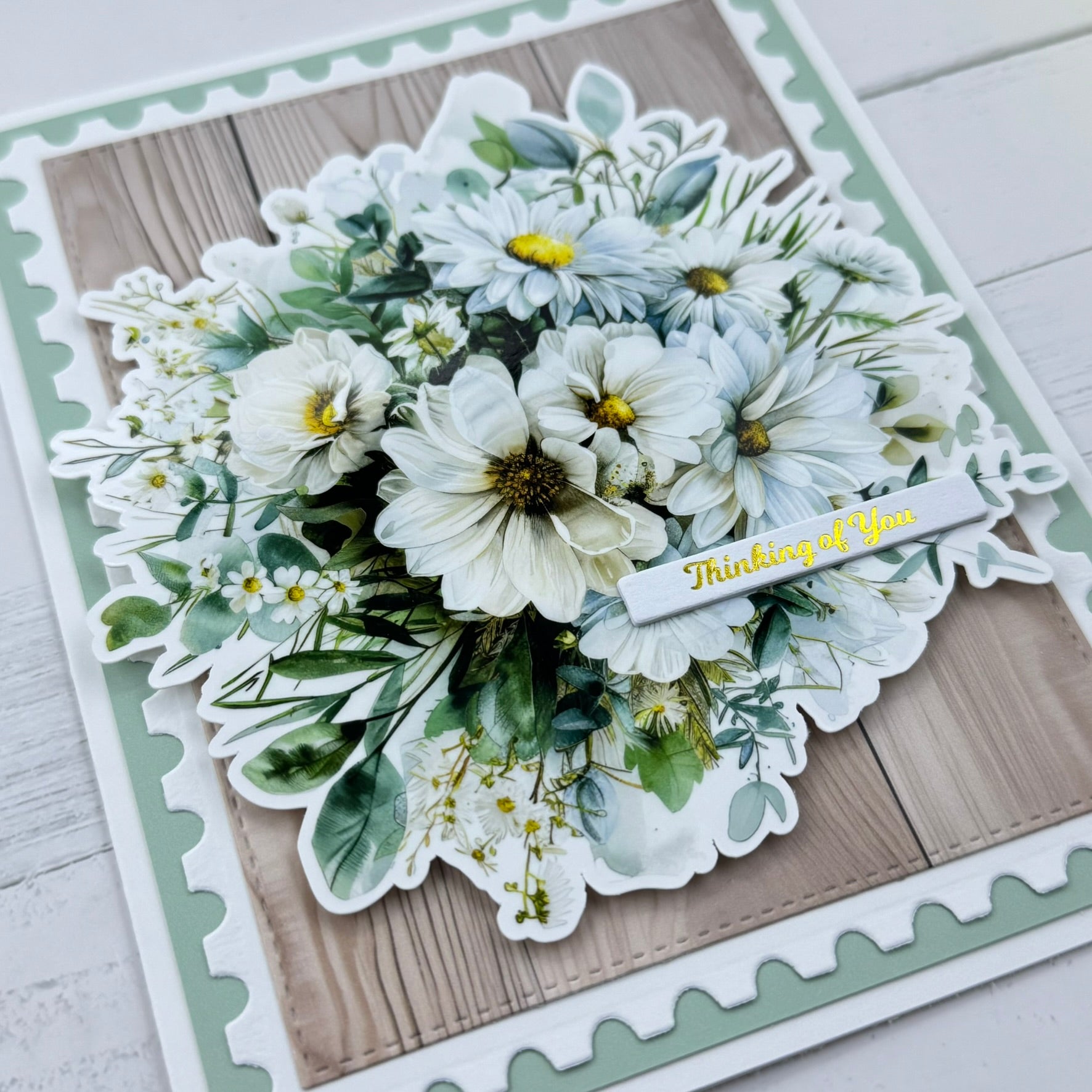 This beautiful card kit was designed with ephemera & papers from Nadine Karen Design. Each card features a gold foiled chipboard sentiment as well as an additional sentiment on the inside. Floral ephemera are printed on a high quality gloss paper.
